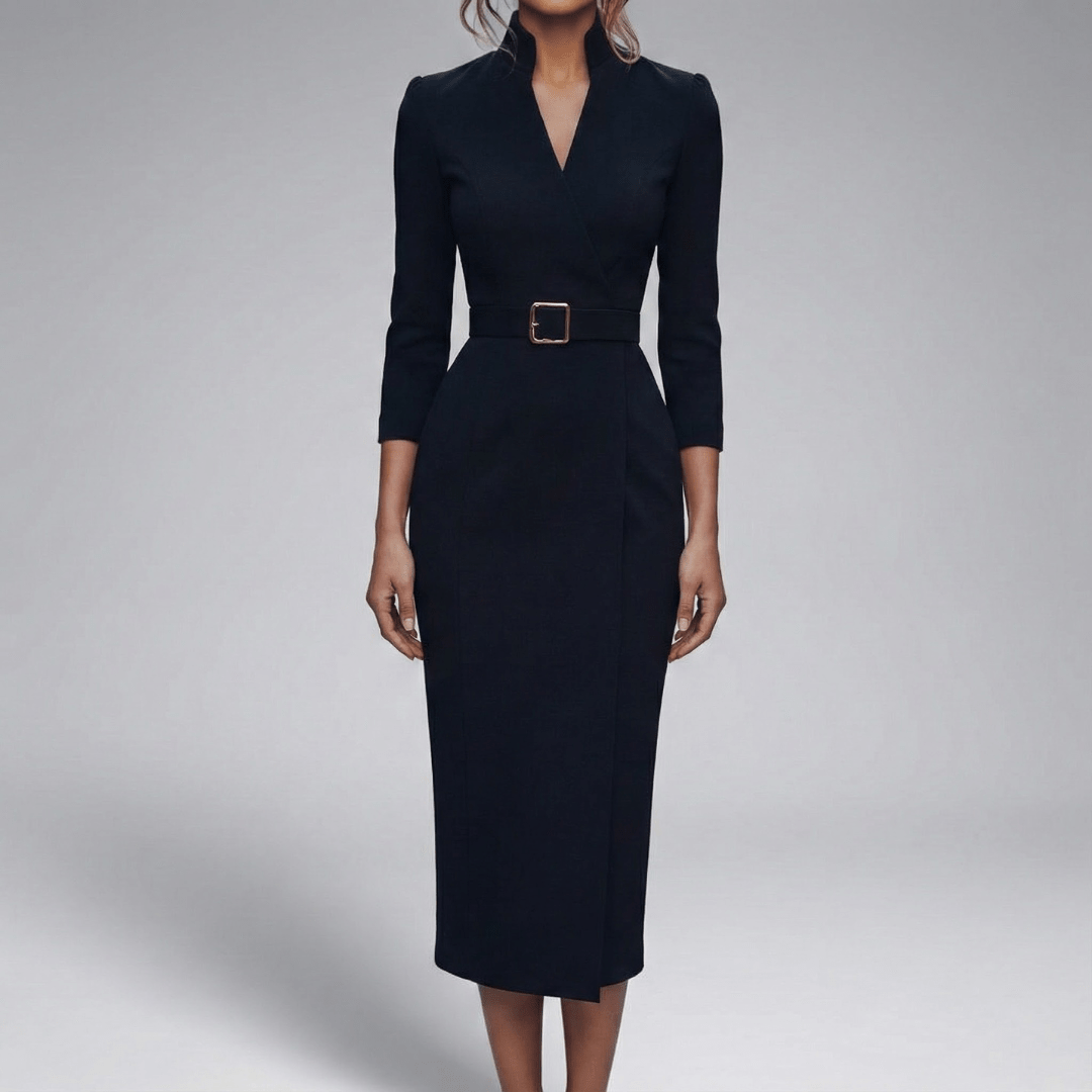 Dieses Midikleid zeigt eine figurnahe, glatt fließende Silhouette mit einem eleganten Wickelausschnitt, der dem Look Struktur und Ruhe verleiht. Der Gürtel definiert die Taille präzise und schafft harmonische Proportionen, während die dreiviertellangen Ärmel eine ausgewogene Balance unterstützen. Ideal für Frauen, die ein Kleid suchen, das angenehm sitzt, klar wirkt und stille Ausdrucksstärke vermittelt.
