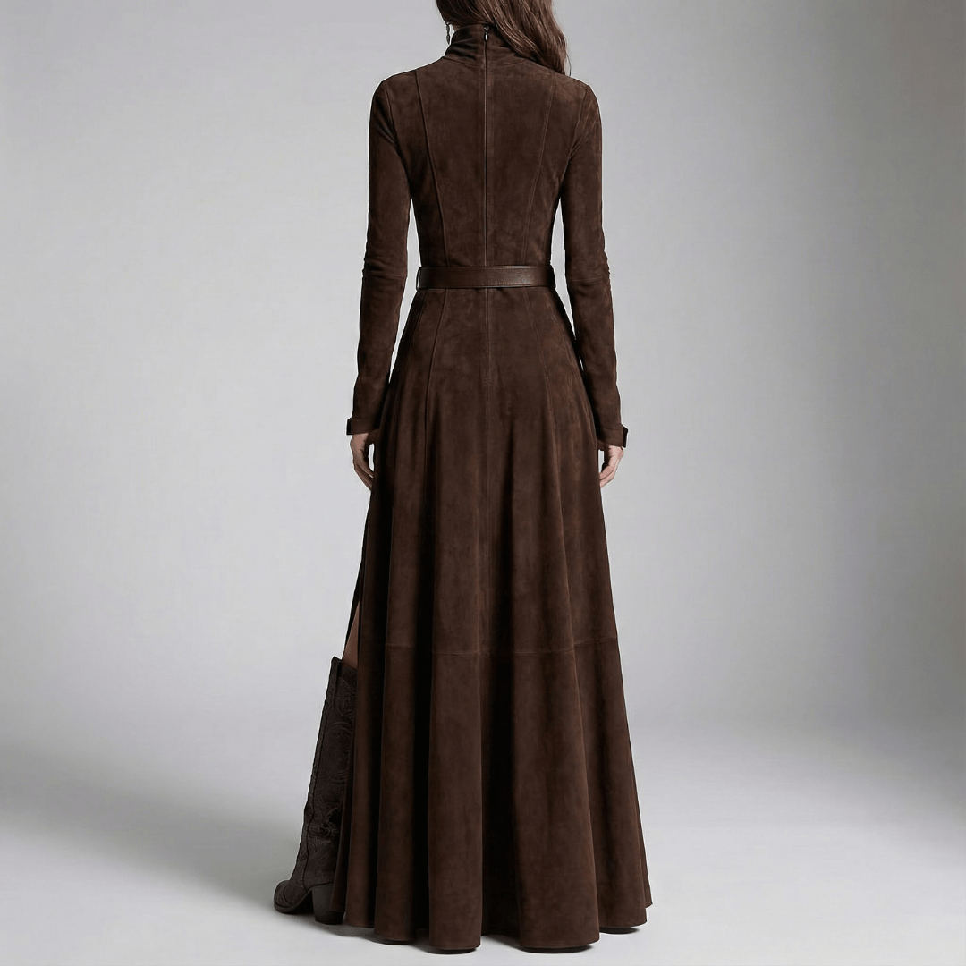 Harmonische Form: Hoher Schlitz und Taillengürtel schaffen klare Linien und unterstützen eine ruhige, ausgewogene Silhouette.