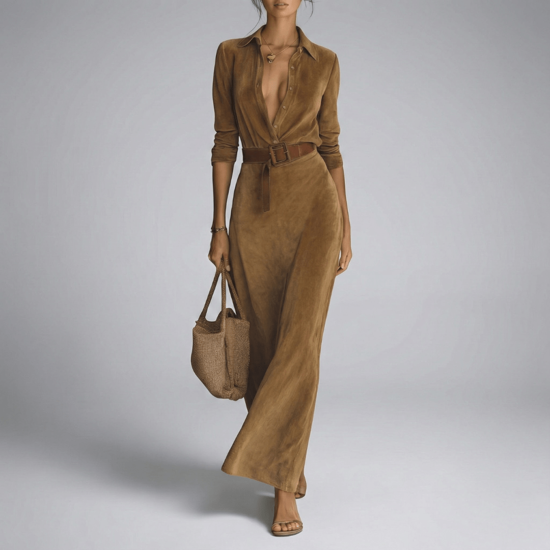 Dieses Maxikleid zeigt eine weich fallende, körpernahe Silhouette mit einem tiefen V-Ausschnitt, der dem Look Länge und Ruhe verleiht. Der Gürtel definiert die Taille klar und schafft ausgewogene Proportionen, während die lange, fließende Form jede Bewegung sanft begleitet. Ideal für Frauen, die ein Kleid wünschen, das angenehm sitzt, leicht wirkt und stille Ausdrucksstärke vermittelt.